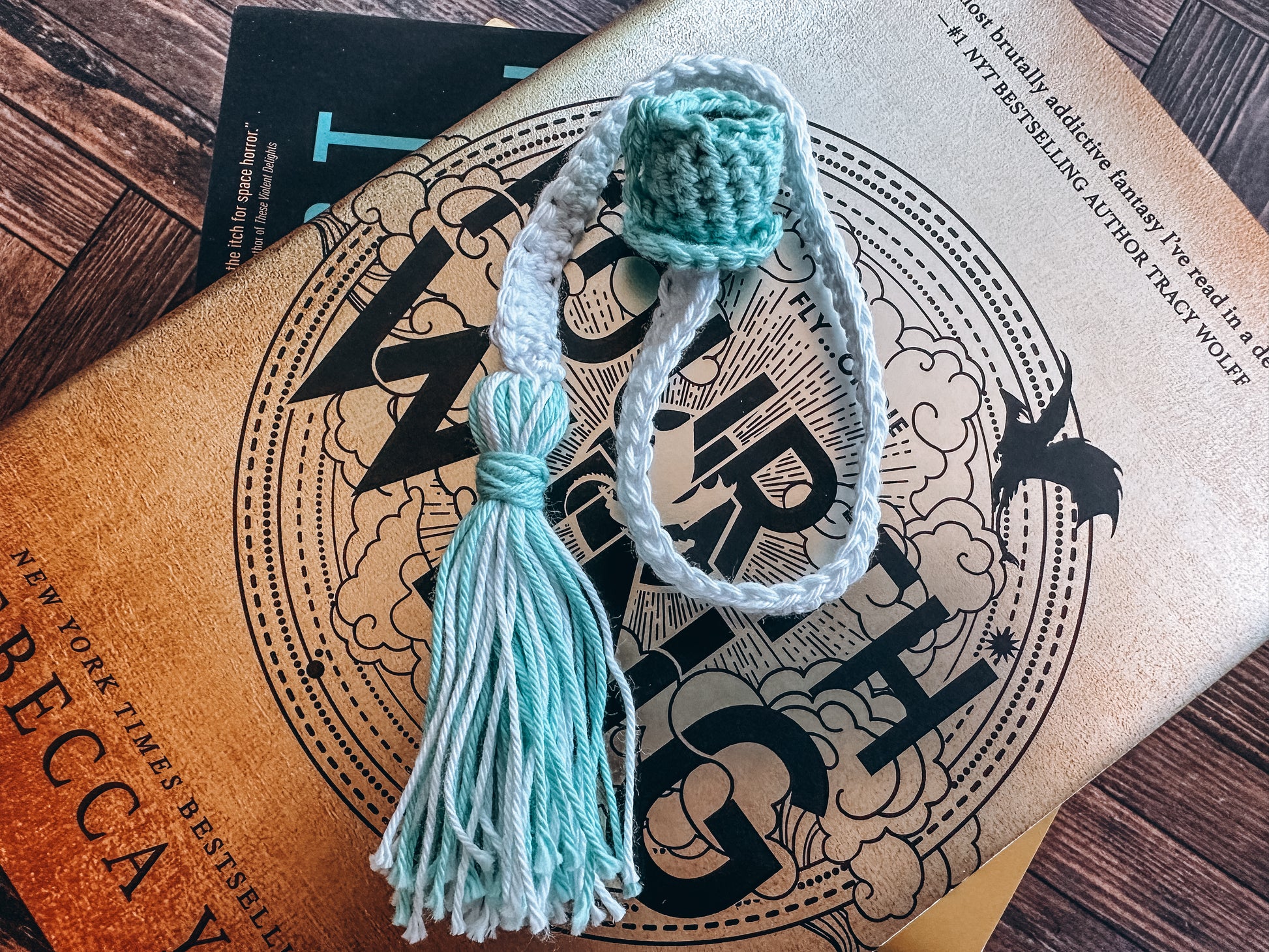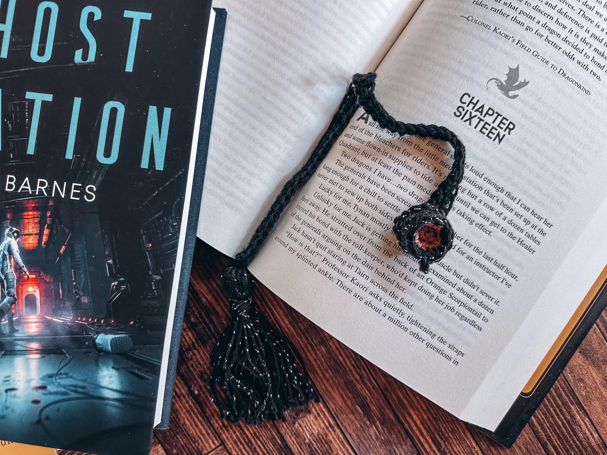 Product Details: Brand of yarn is Lion Brand 24/7 DK Cotton, machine washable with cold water on gentle, Tumble Dry on Low. Each Bookmark Strap comes in three generic sizes: Small - 8in, Medium - 10in, Large - 12in.